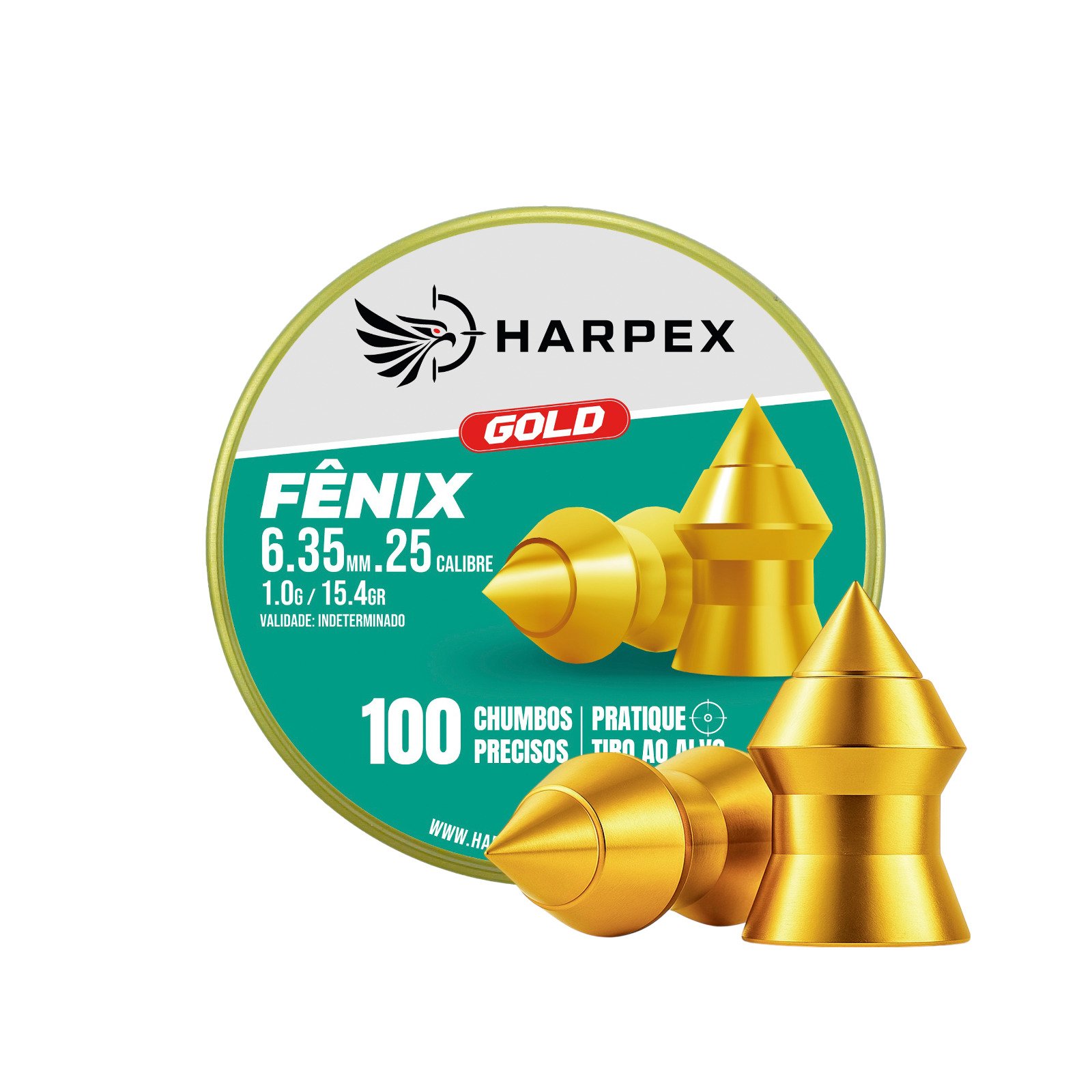 O Fênix Gold da Harpex é um chumbinho leve e preciso no calibre 6,35mm (.25), ideal para tiros com maior velocidade e regularidade.