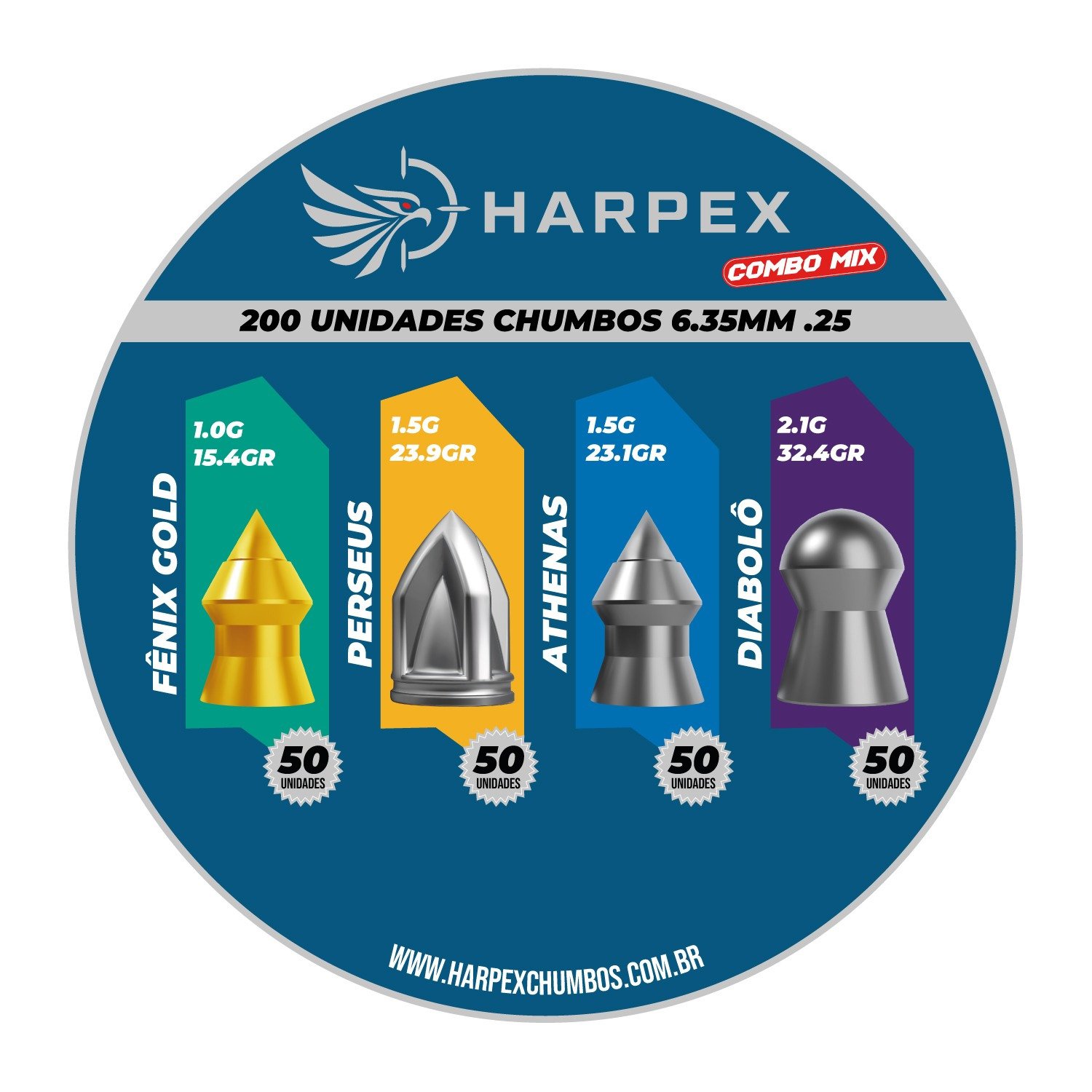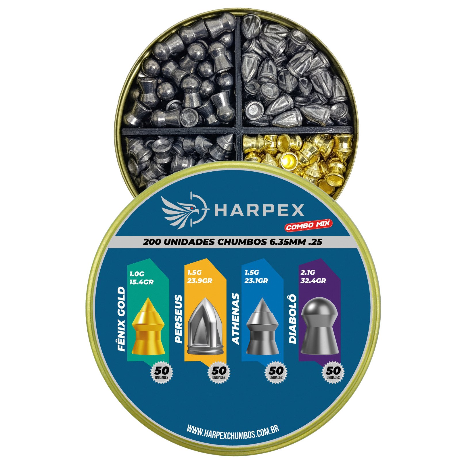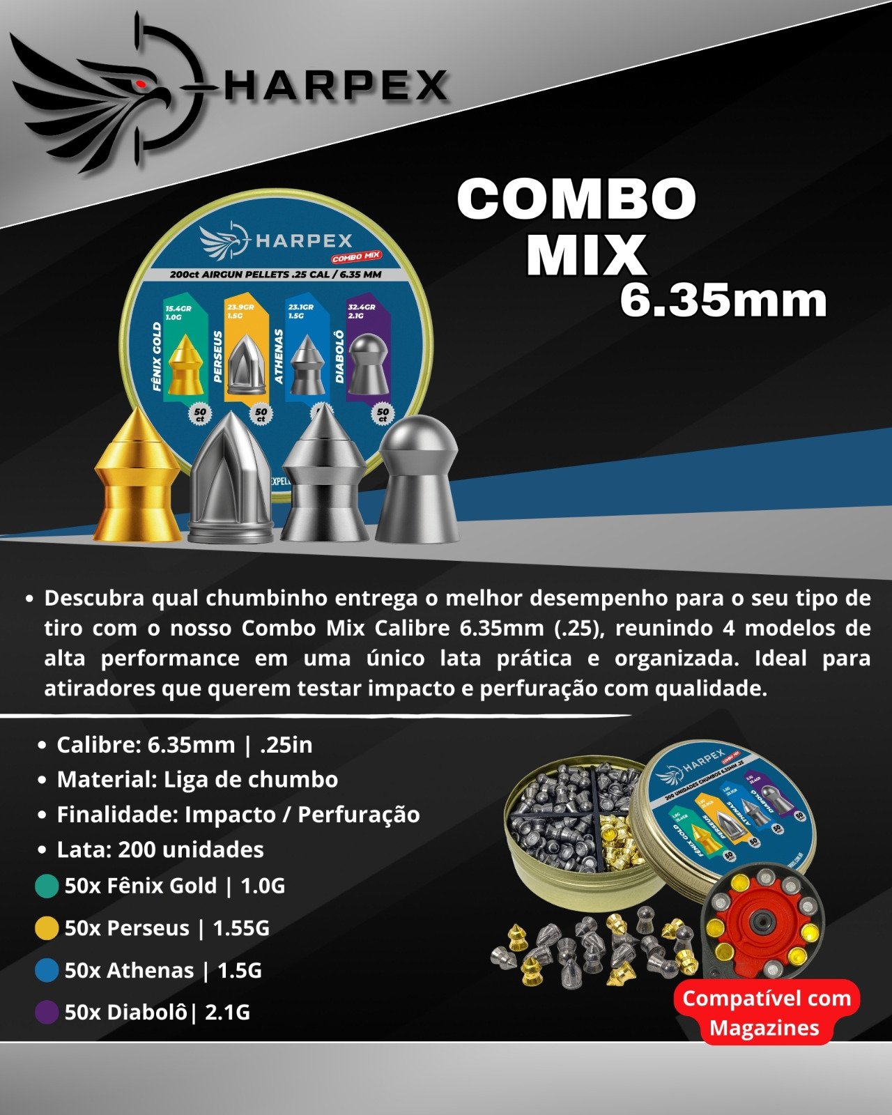 O Combo Mix da Harpex reúne 4 modelos de chumbinhos de alta performance no calibre 6.35mm (.25), ideal para atiradores que querem testar diferentes aplicações em uma única lata prática e organizada.